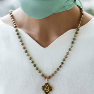 اما نمونه هایی که دارای زنجیر هستند جنس متفاوت تری دارند و غالبا از آلیاژهای فلزی ساخته می شوند. به عنوان مثال گردنبندهای زنانه سنگی که دارای طرح الله هستند، سنگ آن ها از جنس اوناکیت و گردنبند آن نیز به صورت بافت می باشد. در ابعاد 60 سانتی متری هستند و جنس پلاک آن نیز کاملا از استیل ضد زنگ می باشد. مهمترین المان این گردنبند استفاده از ورق طلا 24 عیار برای طرح رویه محصول می باشد.