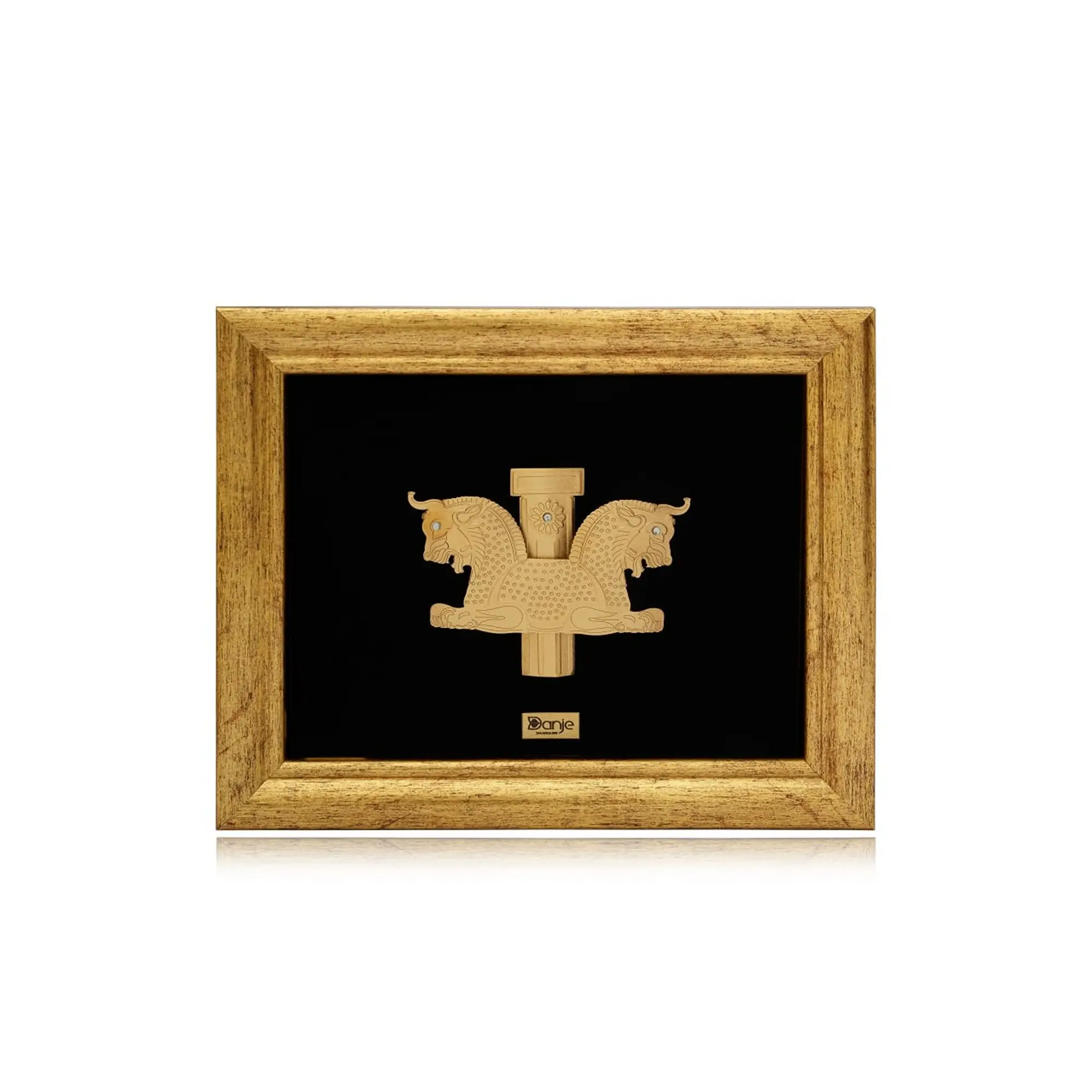 طراحی این تابلو بر اساس الگوی اصیل سر ستون‌های دوره هخامنشی انجام شده است؛ ستون‌هایی که در معماری ایرانی نماد اقتدار، نظم، هندسه و خیال بودند. طرح به‌صورت برجسته روی ورق طلا اجرا شده و همین ویژگی آن را از یک تصویر ساده به یک حجم زنده تبدیل می‌کند.